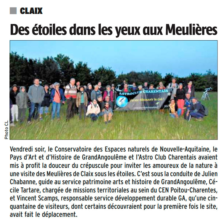 Le 6 mai 2022, le Grand Angoulême a organisé une sortie sur le site protégé des Meulières à Claix / Roullet St-Estèphe pour une cinquantaine de personnes. Cette sortie s’est articulée autour de deux particularités.